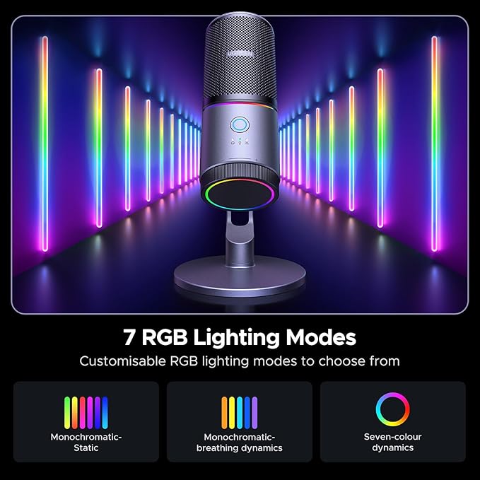 - Dynamic RGB Lights: The microphone for pc has 7 RGB lighting modes, including a dynamic effect, 5 single colors, and a rainbow colors effect, adding a unique atmosphere to your recording environment. Whether you're streaming live or recording videos, these lighting effects create stunning visual effects that enhance the viewer's experience
