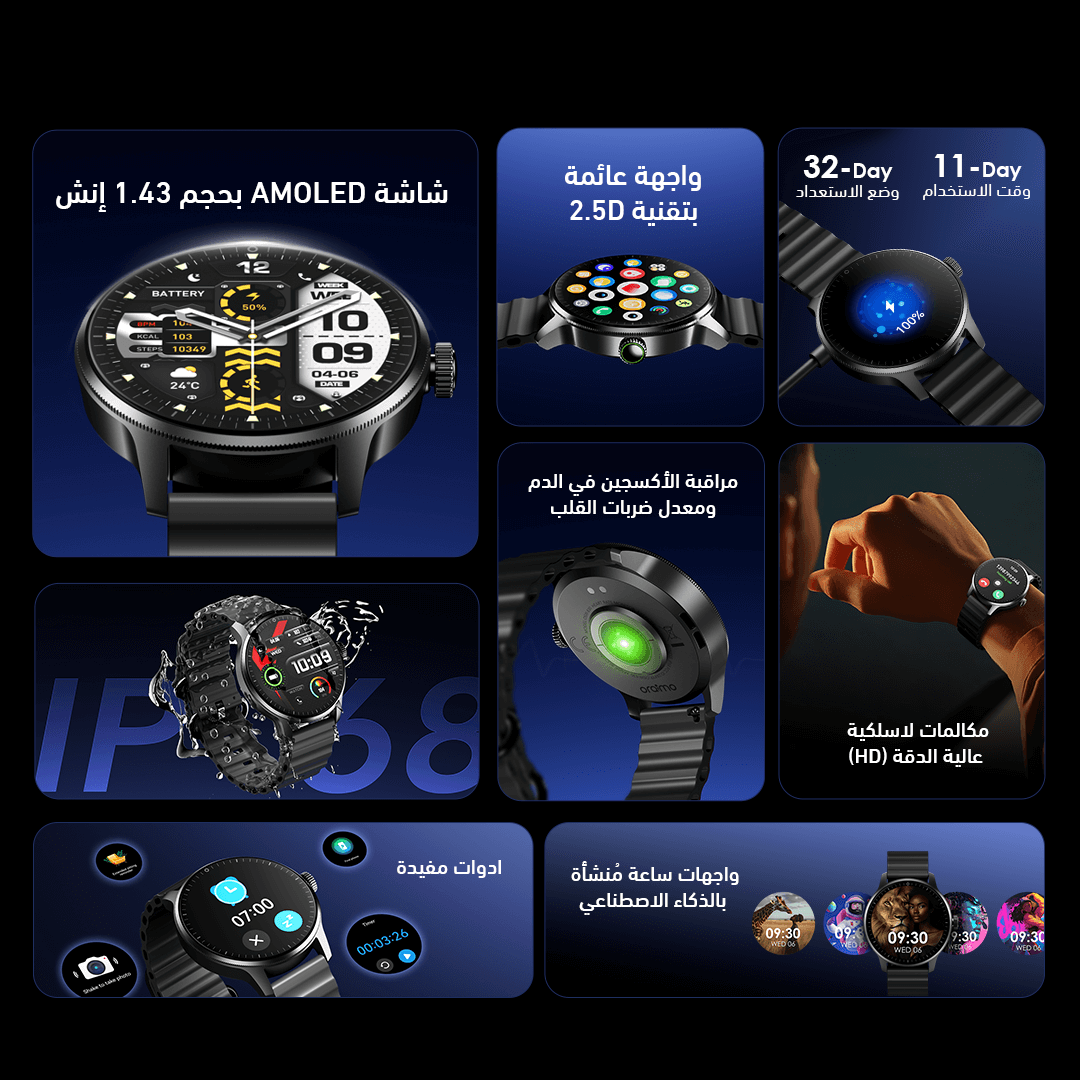 ساعة ذكية بشاشة 1.43 بوصة AMOLED مع واجهة عائمة 2.5D ومقاومة للماء IP68