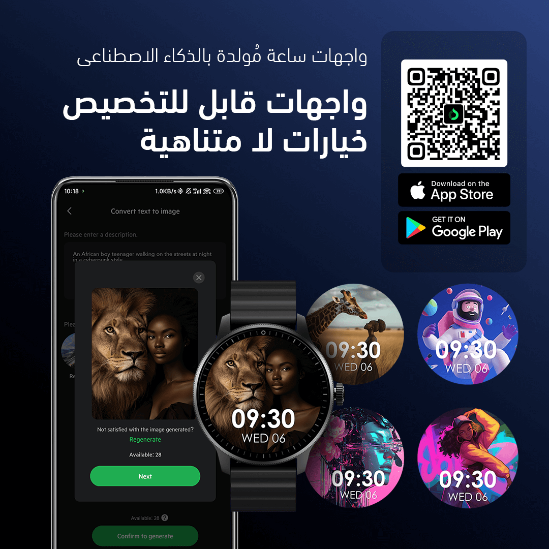 استكشف المزيد من خيارات واجهات الساعة وقم بتخصيص مظهرك مع تصاميم فريدة مولدة بالذكاء الاصطناعي، قابلة للتنزيل من تطبيق oraimo Health.