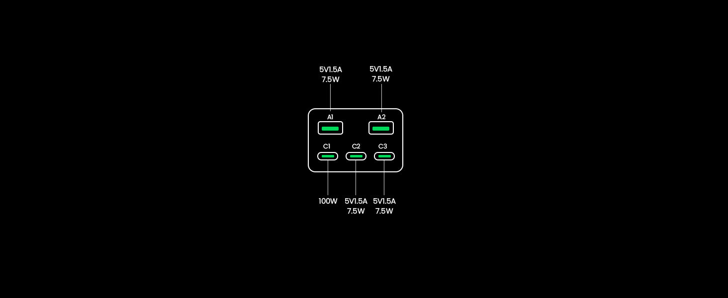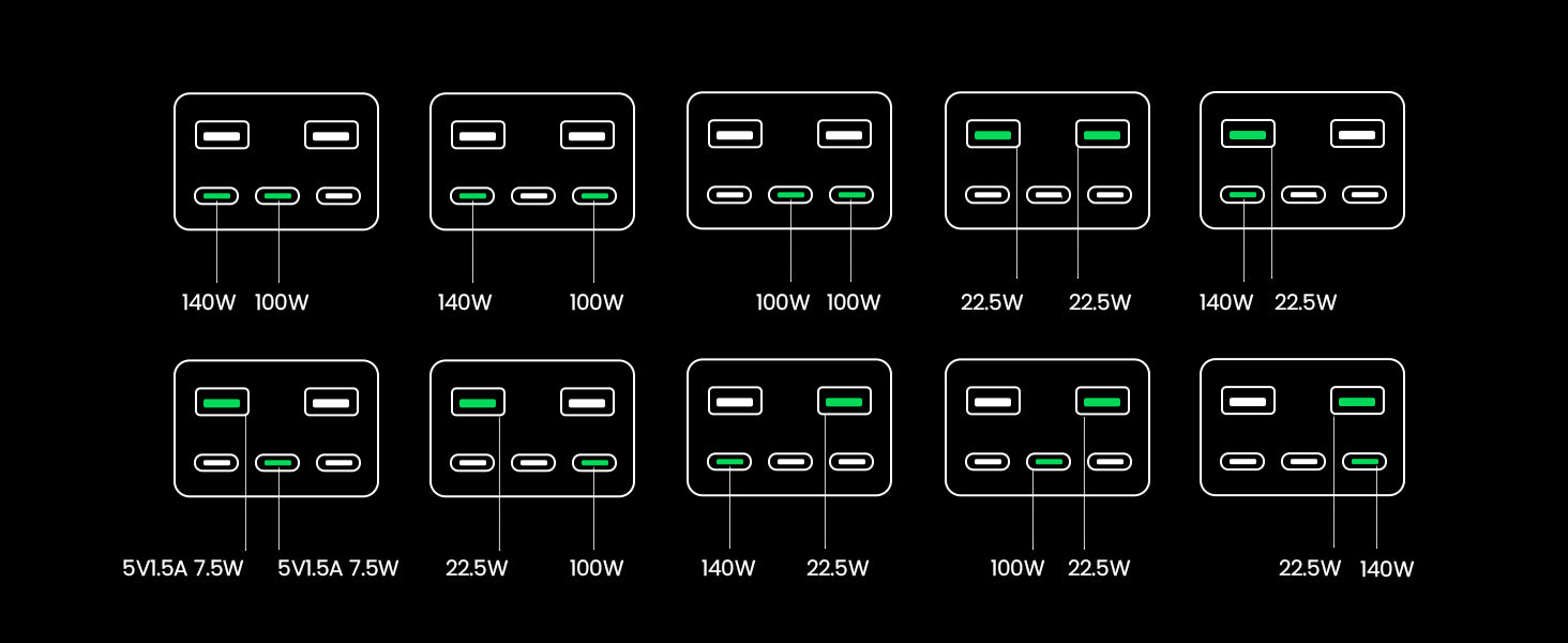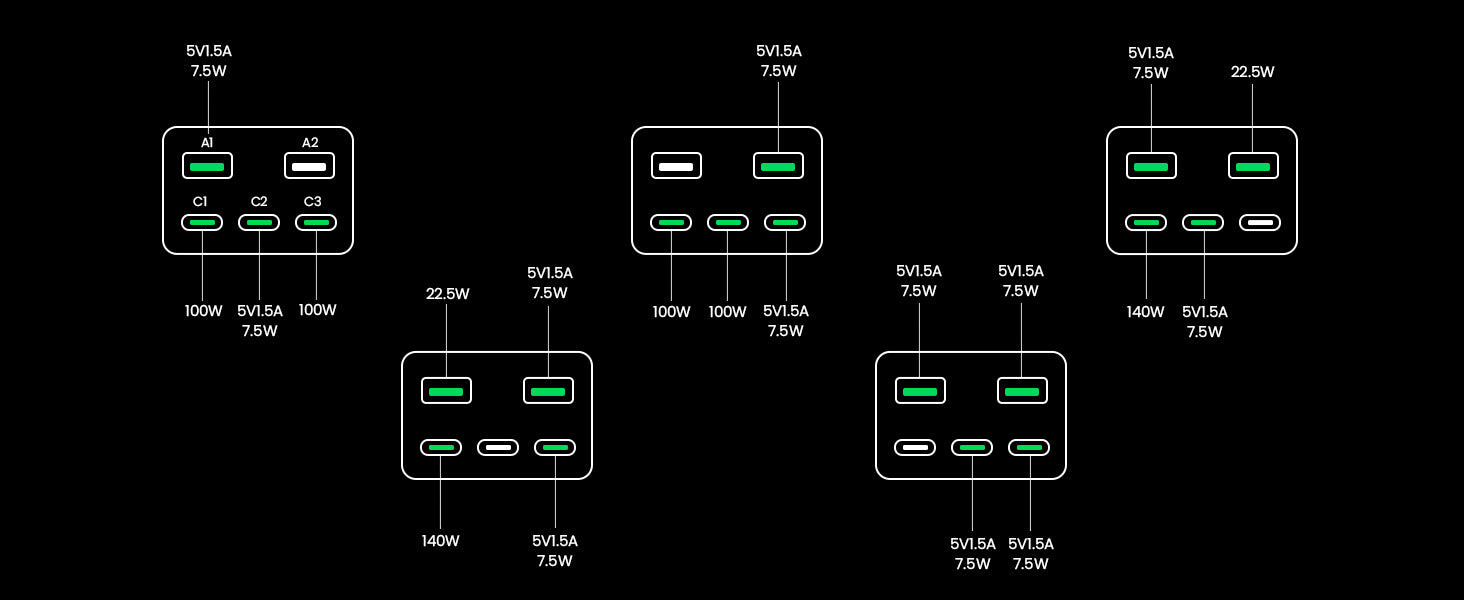 | Output | USB-C1:5V/3A 9V/3A 12V/3A 15V/3A 20V/5A 28V/5A 140W Max PPS:3.3-21V/5A USB-C2/C3:5V/3A 9V/3A 12V/3A 15V/3A 20V/5A 100W Max PPS:PPS:3.3-21V/5A USB-A1/A2:5V/3A 9V/2A 12V/1.5A 10V/2.25A 22.5W |