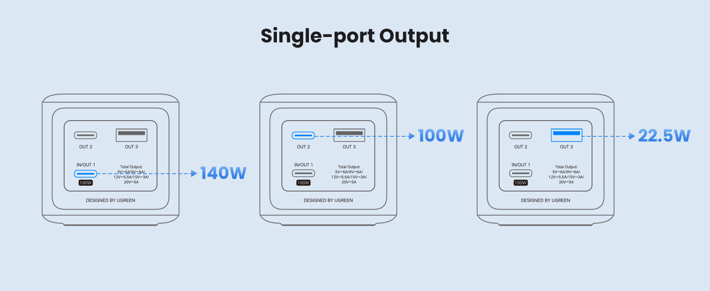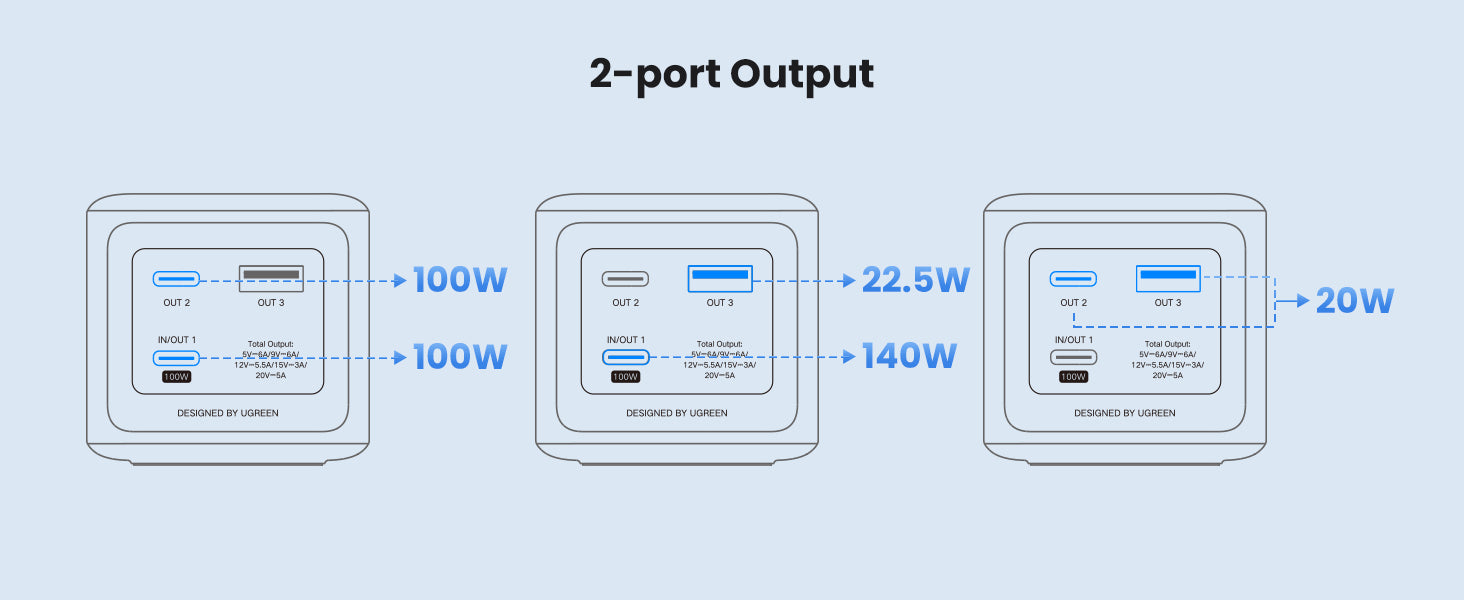 | Output | USB-C1 : 5V3A 9V3A 12V3A 15V/3A 20V/5A 28V/5A 140W Max USB-C2 : 5V3A 9V3A 12V3A 15V/3A 20V/5A 100W Max USB-A: 5V3A 9V2A 12V1.5A 10V2.25A |