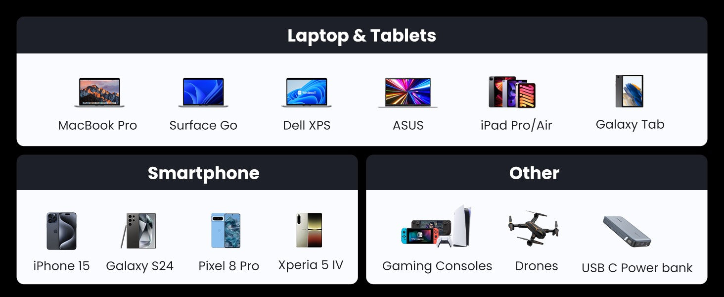 | Compatible Devices | Compatible with USB-C devices, such as laptops(Macbook Air/Pro 2020, Dell XPS 13/15, HP Spectre x360/Envy, Lenovo ThinkPad, ASUS ZenBook 14, Surface Laptop), smartphones(iPhone 15/15 Plus/15 Pro/15 ProMax, Galaxy S24/S23/S22/ S21/S20/S10/S9/S8, Galaxy Note20/10/9/8, Galaxy A50/A70/A51/A71, Galaxy Fold/Z Fold2/Z Fold3/Z Fold4, Motorola Moto G seires, Moto One seires, Moto Edge series, Moto Razr series, Pixel 8/7/7 Pro/6/6 Pro/5/4/3, OnePlus 10/9/8/Nord, etc), tablets(iPad Air 4/mini 6/Pro 2021, Galaxy Tab A9+/S8/S7, Surface Pro, Lenovo Yoga Tab); and other devices like Nintendo Switch, Steam Deck, Fitbit Versa3/4, GoPro HERO 10, USB-C power bank |